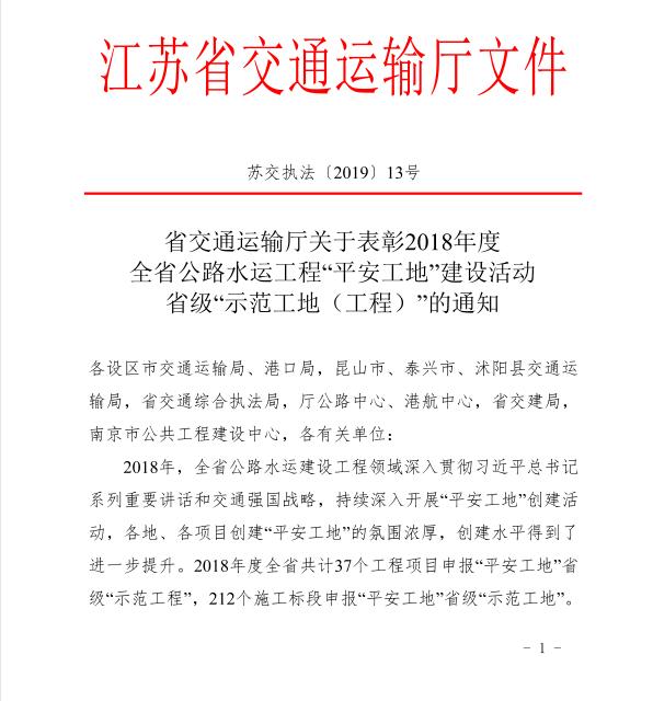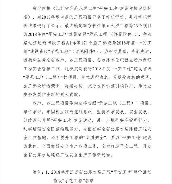 由中港建設集團有限公司施工的“南通港呂四港區10萬噸級進港航道(二階段)工程”被江蘇省交通運輸廳表彰為全省公路水運工程省級平安示范工地,體現了我公司牢固樹立紅線底線意識的自覺性,堅持科學發展、安全發展的前瞻性,深入開展平安工地建設的持續性。