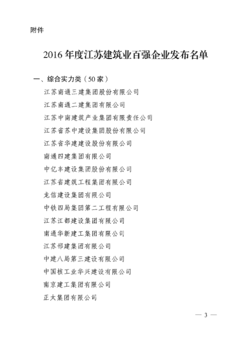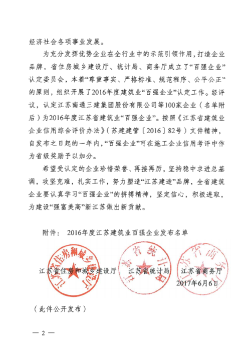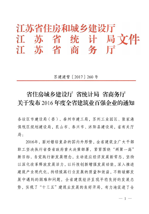 在江蘇省住房和城鄉建設廳、江蘇省統計局、江蘇省商務廳聯合成立的“2016年度百強企業”認定委員會評選中,中港建設集團有限公司榮獲“2016年度江蘇省建筑業百強企業”榮譽稱號。